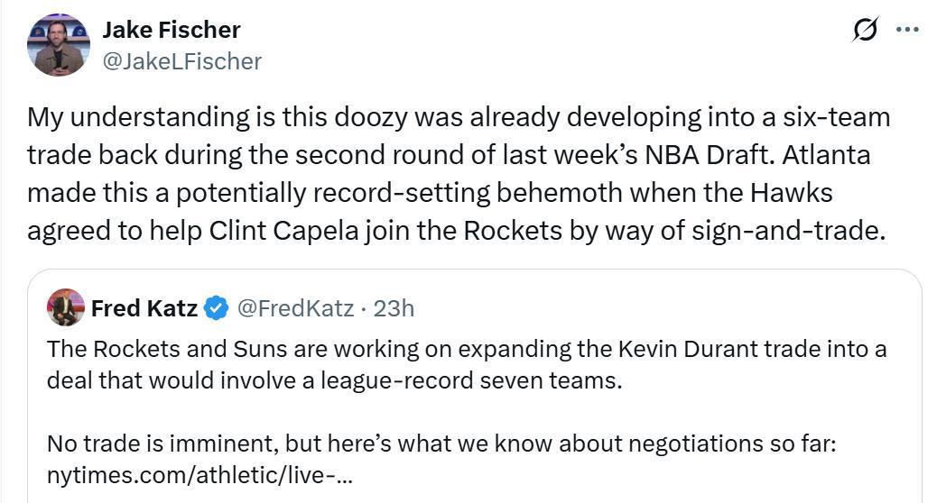 根据美记Jake Fischer报道,经过又一轮谈判后,火箭队与太阳队围绕杜兰特的交易将扩大到创造NBA历史纪录的7队大交易。