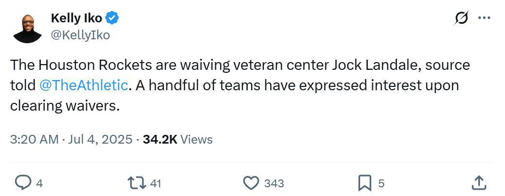 首先是The Athletic火箭记者Kelly Iko曝出,火箭队将裁掉中锋兰代尔,后者将在48小时澄清期后恢复自由身,目前多支球队有意得到他。