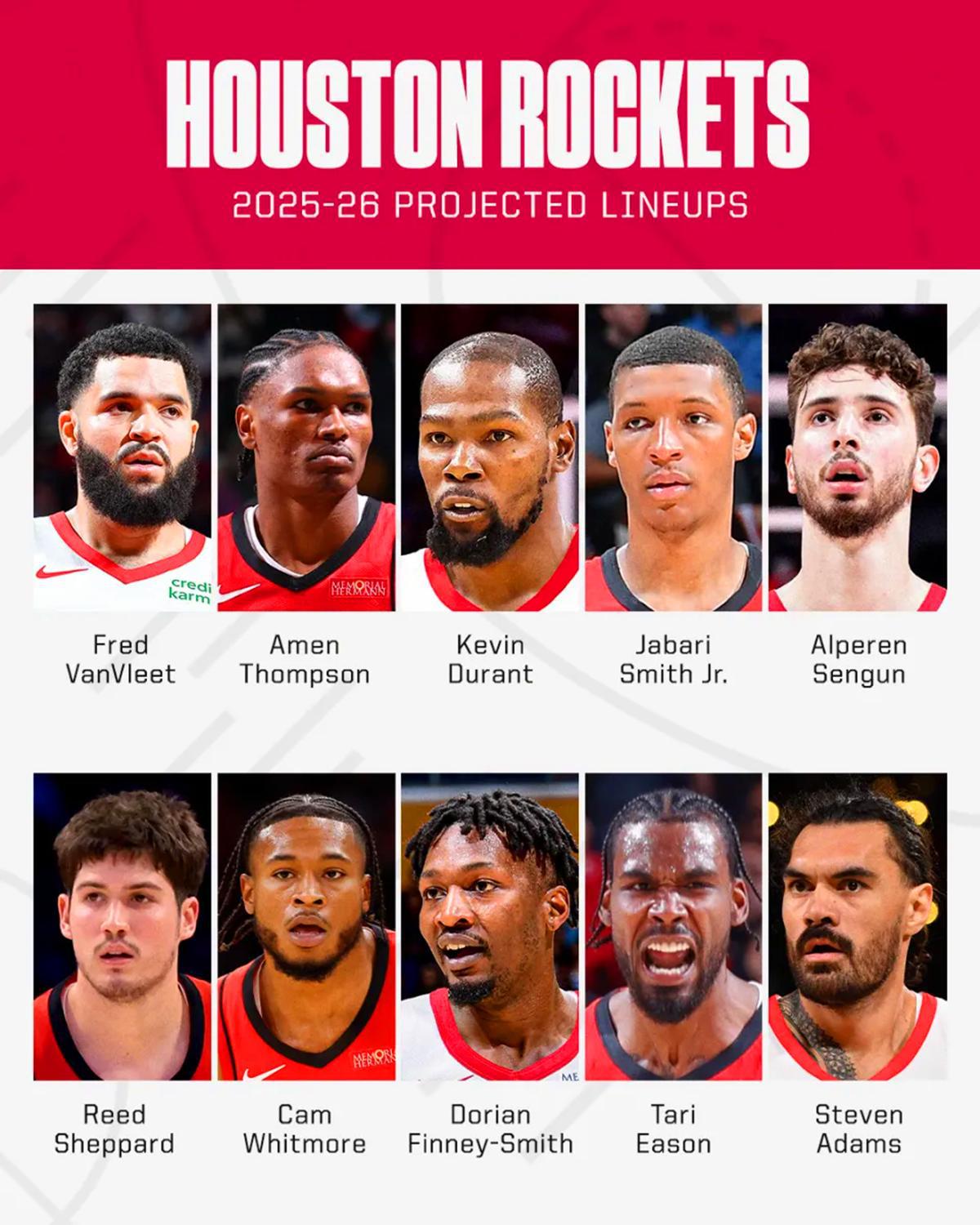 潜在首发:范弗利特、阿门、杜兰特、小贾巴里史密斯和申京。