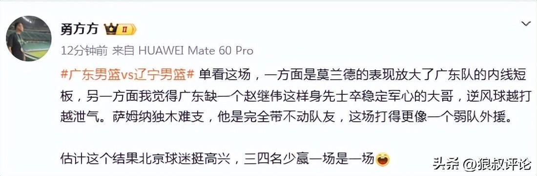 单看这场,一方面是莫兰德的表现放大了广东队的内线短板,另一方面我觉得广东缺一个赵继伟这样身先士卒稳定军心的大哥,逆风球越打越泄气。萨姆纳独木难支,他是完全带不动队友,这场打得更像一个弱队外援。